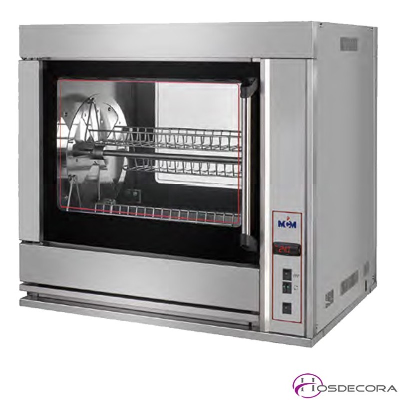 Asadores de pollos de bajo consumo con balanceras 75-BA-4B, proporcionan un asado uniforme por aire forzado. No necesitan extracción de humos. Se pueden cocinar otros platos como redondo de ternera, conejo, cochinillo, cordero, codillos, incluso verduras: patatas, pimientos, tomates y berenjenas. No es necesario pinchar los productos a asar
