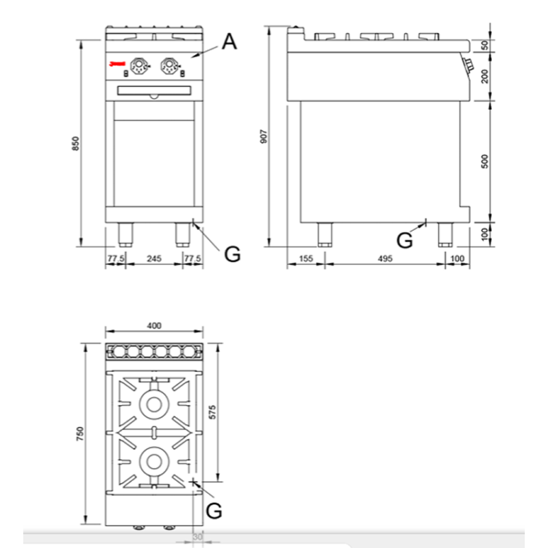 Cocina a gas 2 fuegos 14.8 Kw. potente