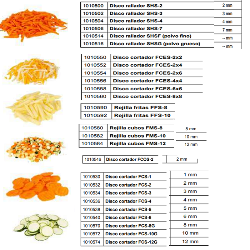 Combinando entre sí estos accesorios se pueden obtener más de 35 tipos de cortes y rallados diferentes.