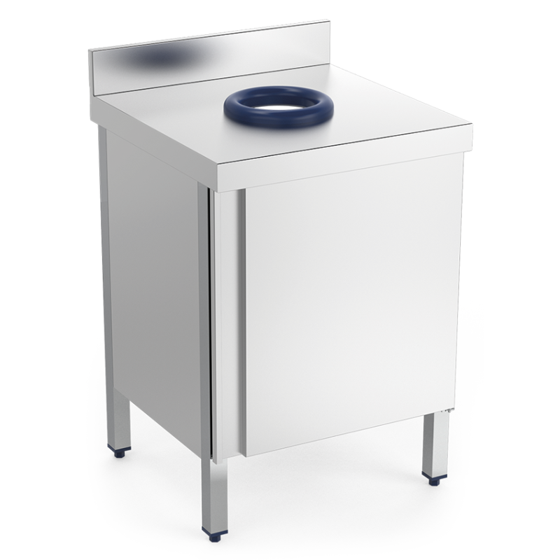 Fabricada en acero inoxidable, esta mesa mural con puerta incorpora un aro de goma de desbarasado, fácilmente desmontable para su limpieza.