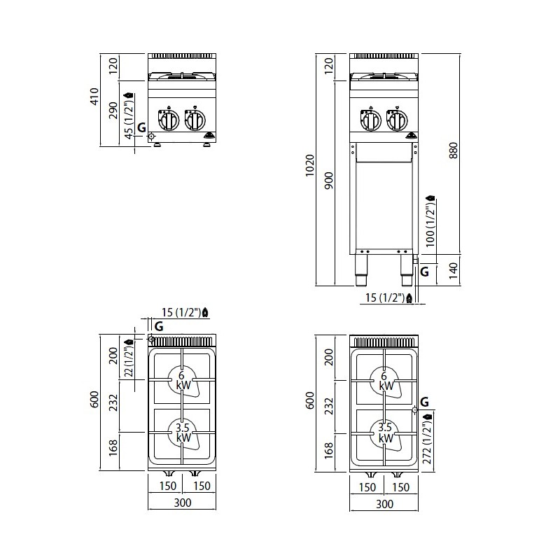 - Potencia Fuegos: 1 de 6 kW y 1 fuego de 3.5 kw.