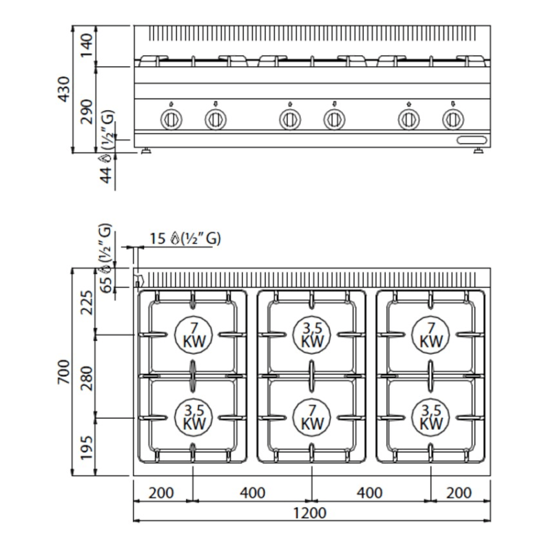 Potencia 6 Fuegos: Fuegos: 3 x 7 kW / 3 x 3.5 kW.