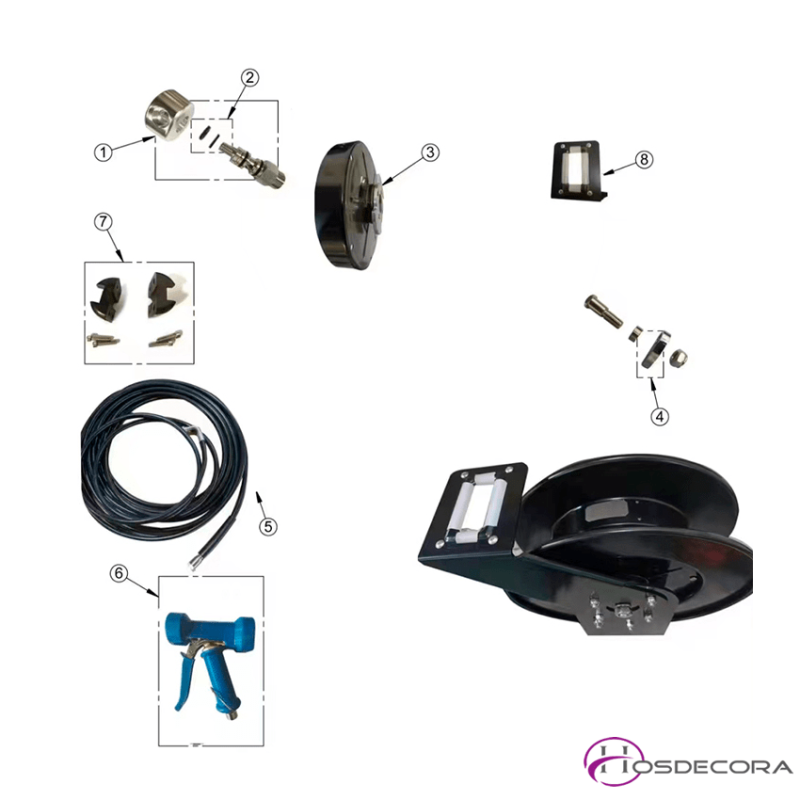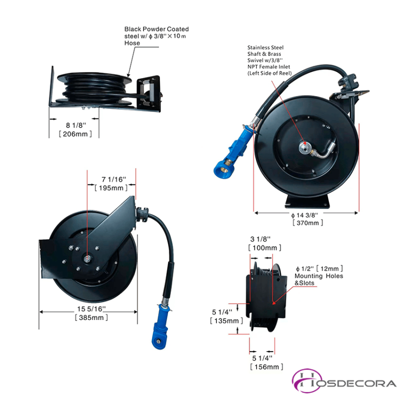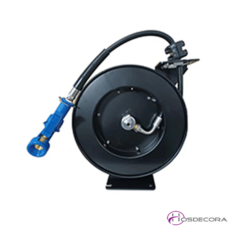 Sistema de manguera retráctil, enrollable en el interior, con sistema de bloqueo que permite mantener sin esfuerzo la longitud de manguera deseada en cada uso.