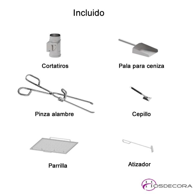 -Incluye: parrilla, cortatiros, atizador, pala, pinza y cepillo.