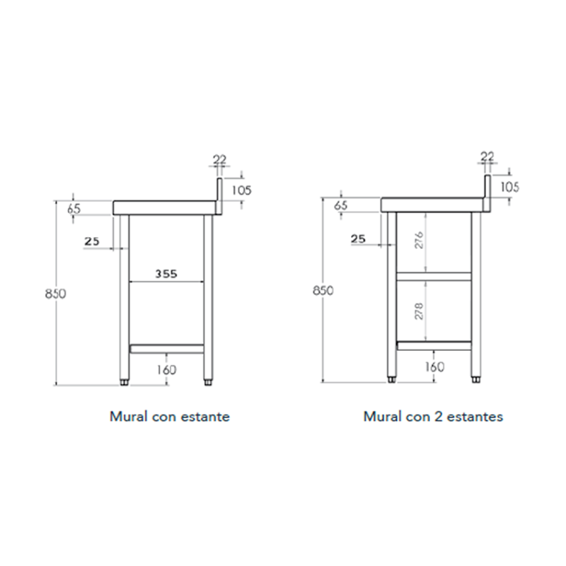 Mesa de acero inox Sin estante dimensiones desde 60X50X85 (con patas extensibles que alcanzan los 90 cm).