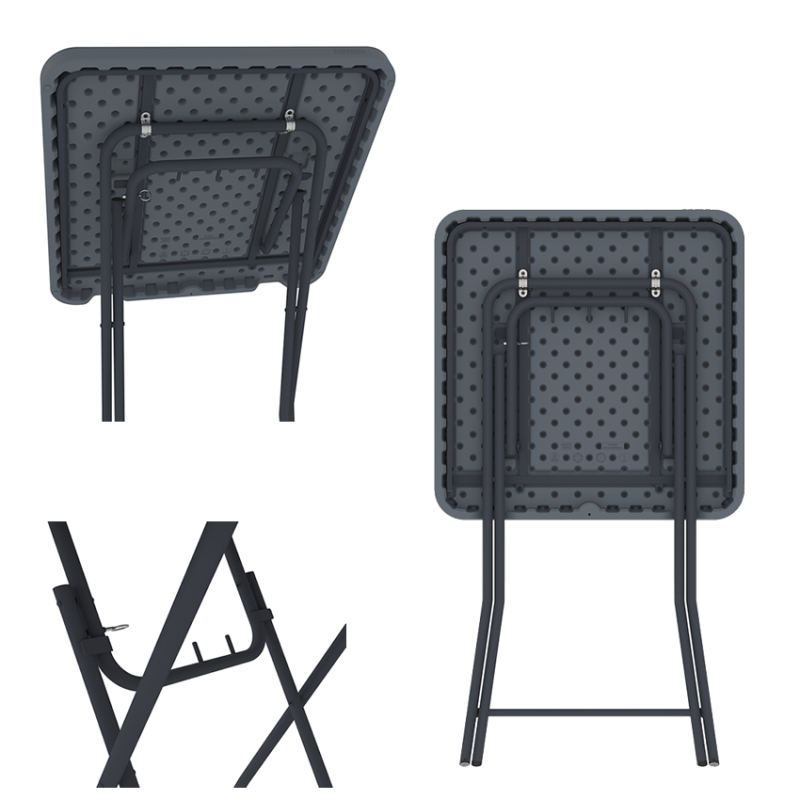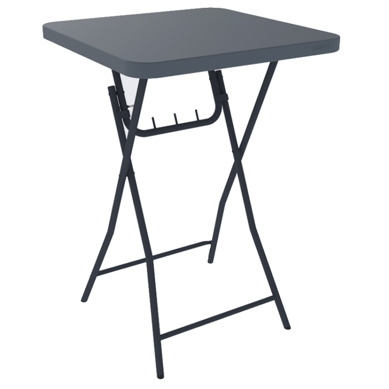 El diseño de esta mesa alta cuadrada favorece una interacción cómoda y dinámica entre los asistentes, tanto de pie como con taburetes altos.