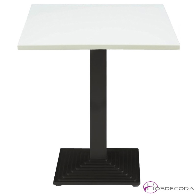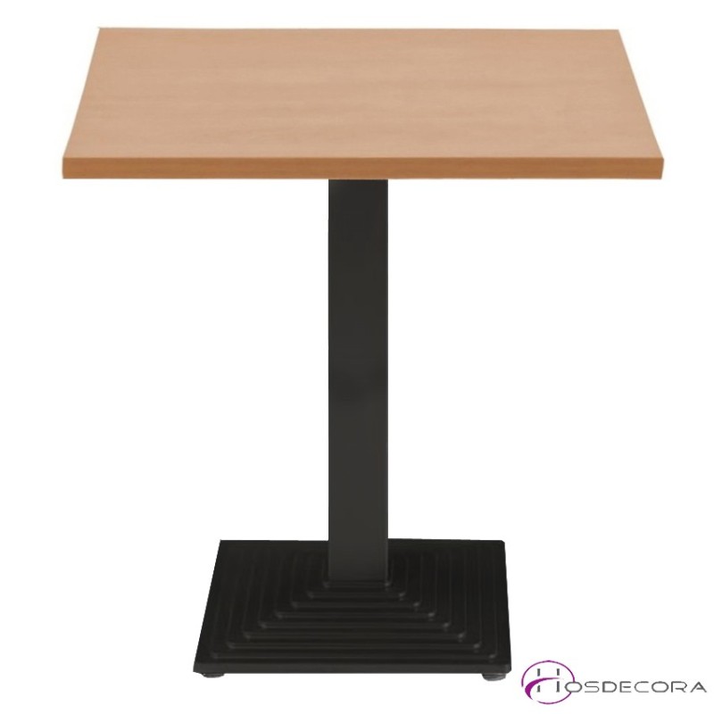 Mesa para cafeterías con tablero cuadrado en Melamina modelo Rueda, con tubo acerado plastificado con base de hierro fundido plastificado para locales de hostelería