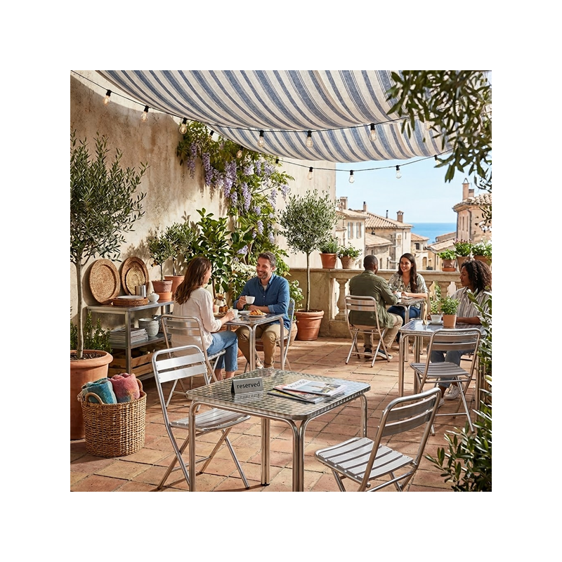 Su diseño apilable facilita el almacenamiento en temporadas de menor uso o durante la recogida diaria de las terrazas.