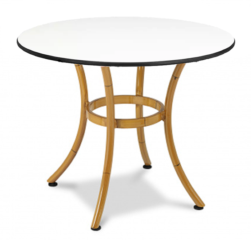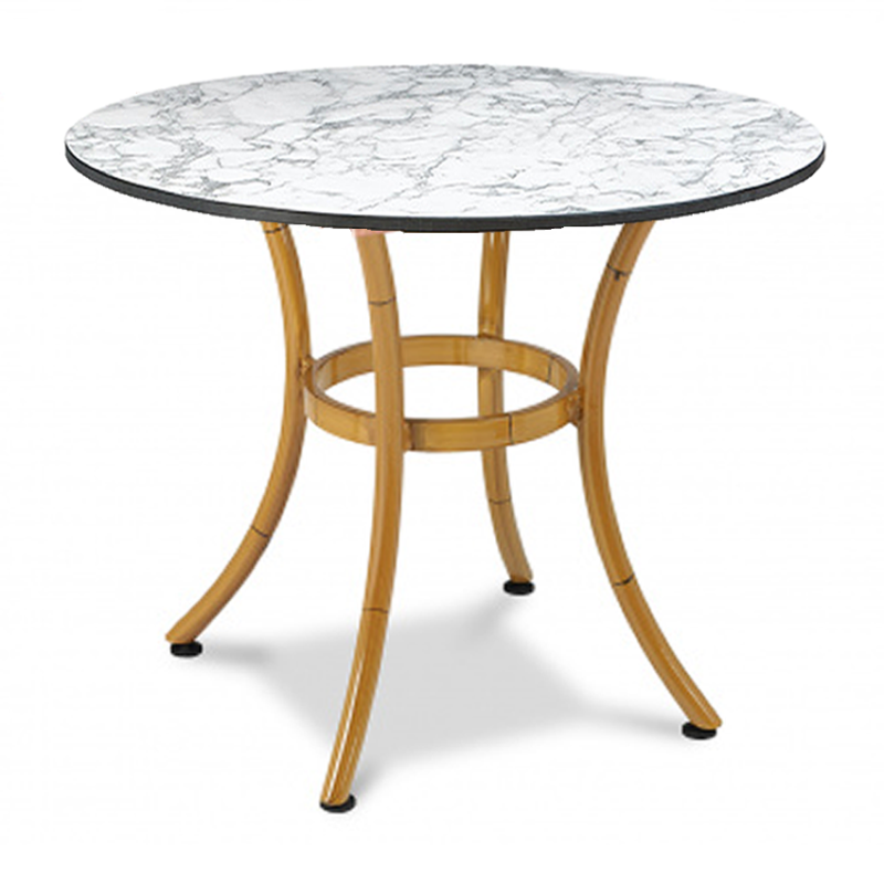 Mesa con tablero compacto redondo para cafeterías de uso interior y exterior. Estructura en aluminio plastificado color caña