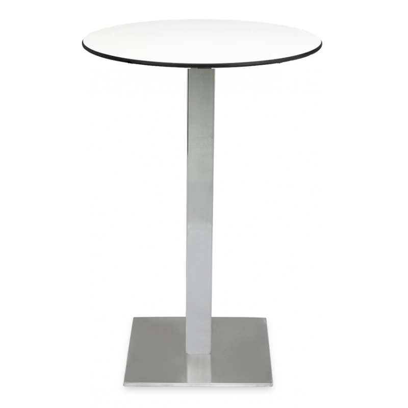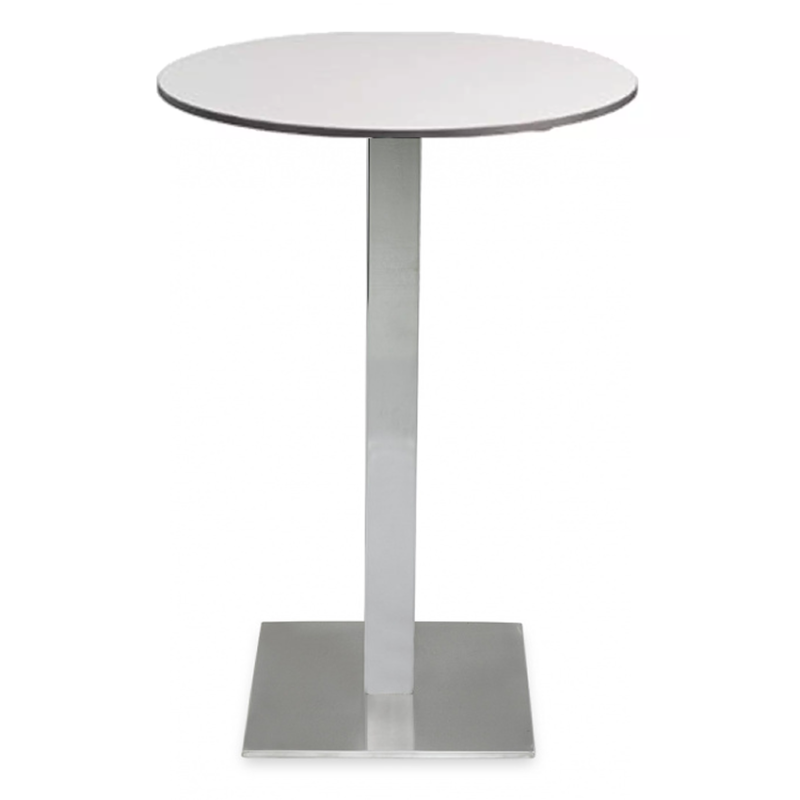 Mesa alta para comedor hostelero con tablero de 60 en compact, con tubo aluminio anodizado y base de acero inoxidable. CORBERA