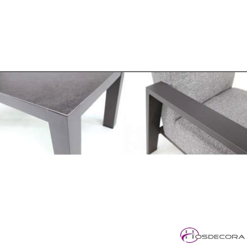 - 1 Mesa de centro con estructura de aluminio antracita y cristal porcelánico, con unas medidas de 110 x 60 x 46 cm.