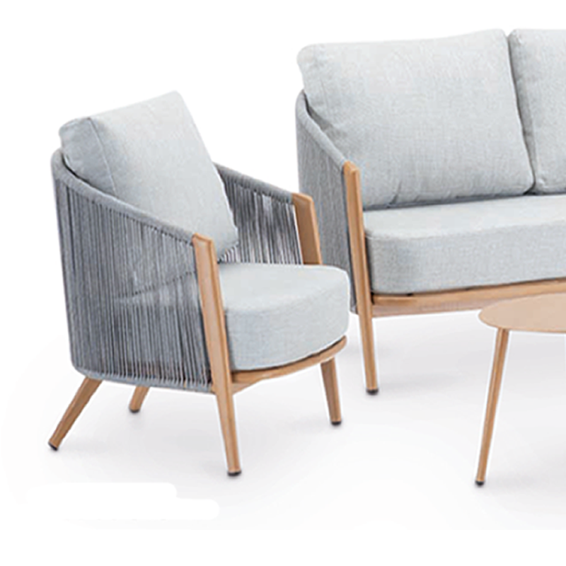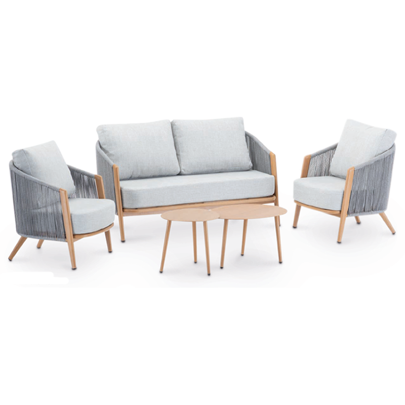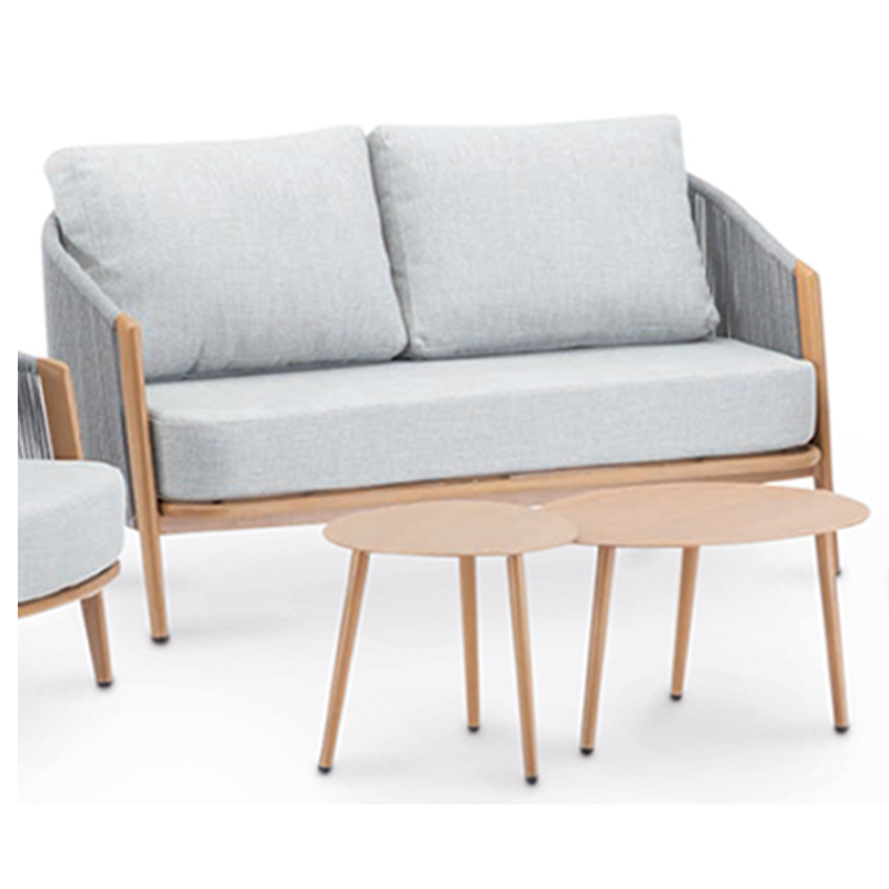 Incluye sofá de 2 plazas, dos sillones y doble mesa de centro de aluminio color madera