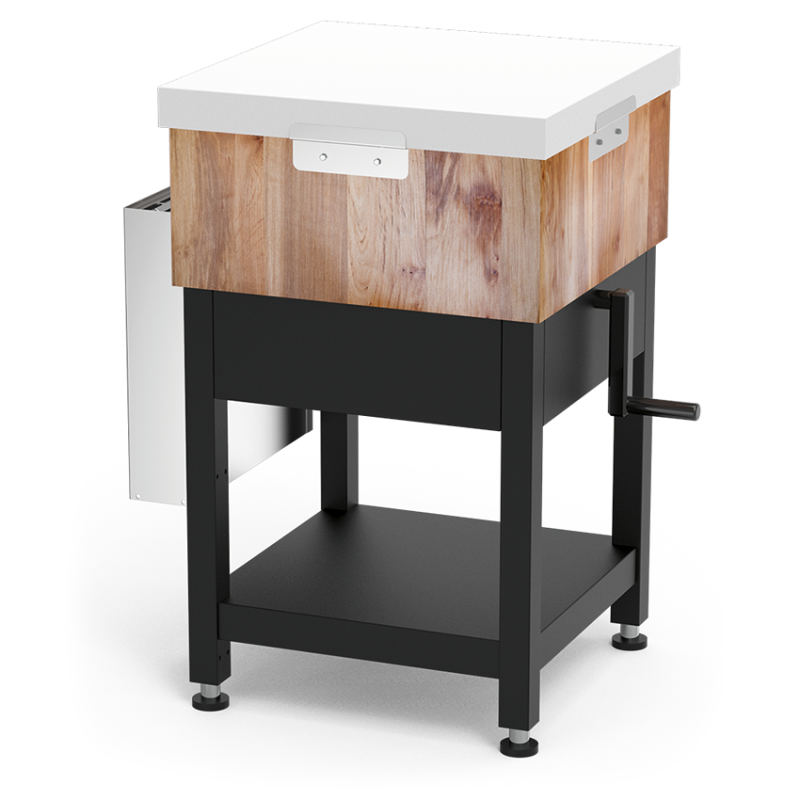 Este modelo además incorpora un sistema de elevación que permite regular la altura de la superficie de trabajo.