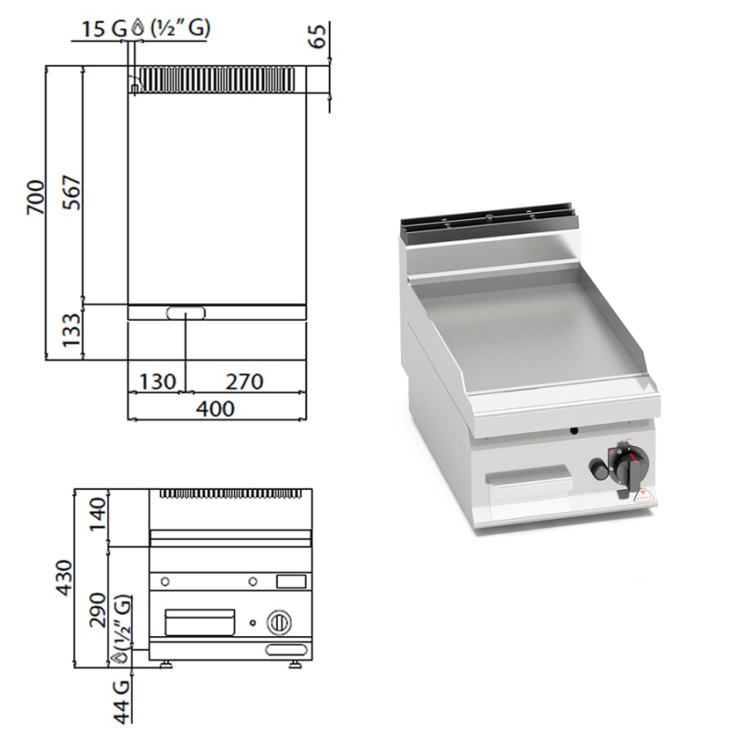 Plancha de acero a Gas para cocinas profesionales G7FL4B que permiten la cocción “por contacto” de cualquier tipo de comida.