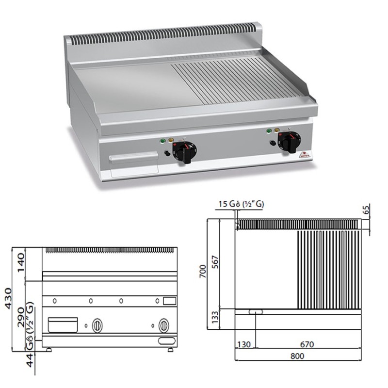 Plancha para cocinas con placa Lisa y ranurada de acero a Gas profesionales G7FM8B-2 que permiten marcar carnes y verduras.