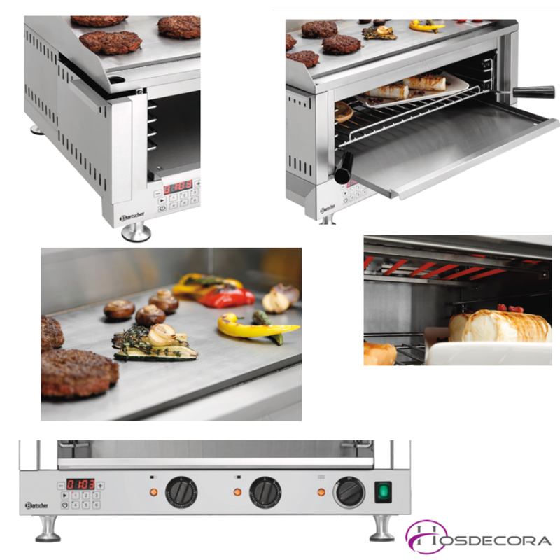 Plancha electrica con salamandra en la parte inferior es una combinación compacta de grill y gratinador con 2 zonas de calentamiento