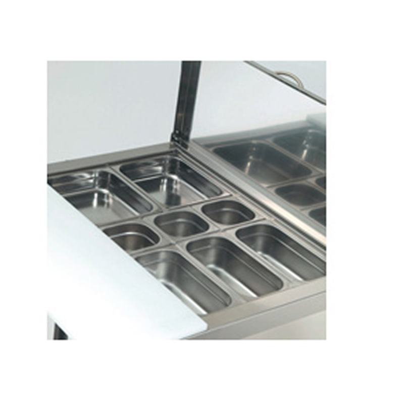 Mesa refrigerada preparación de ensaladas y pizzas MPGE-100 con alojamientos para cubetas GN de diferentes tamaños.