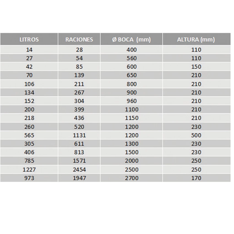 - Dimensiones de la Cacerola recta de 406 litros: Diámetro 150 cm Altura 23 cm. -Asas 4. (813 raciones)