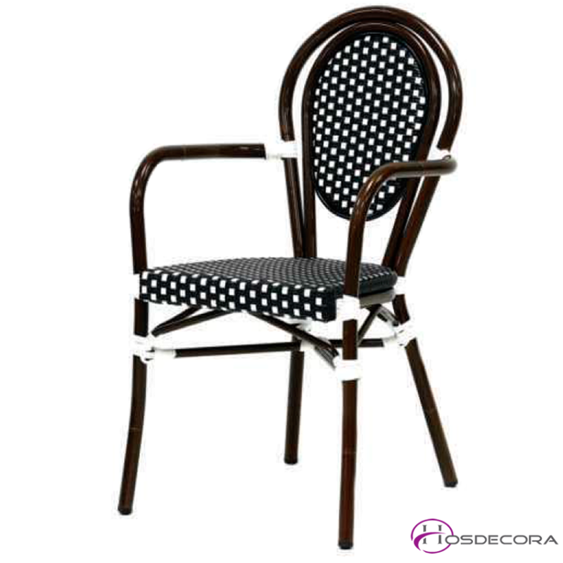- Con estructura de aluminio en color bamboo o teka y asiento y respaldo rattan sintético negro-beige o negro-blanco.