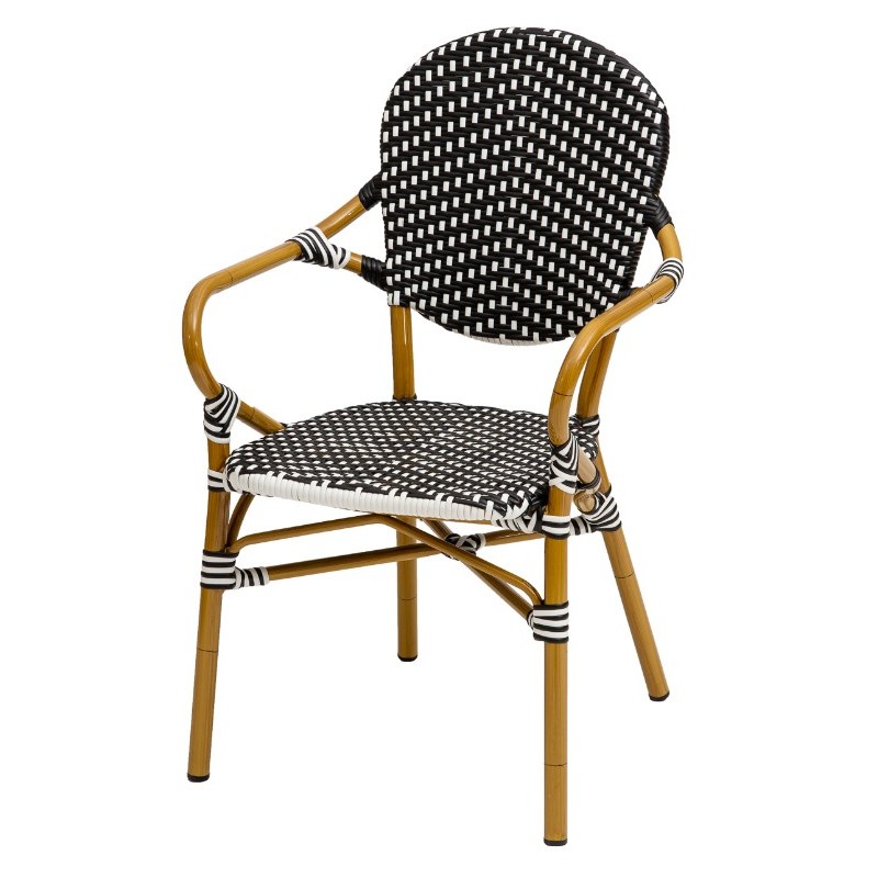 Sillón de terraza aluminio con asiento y con un reposabrazos en rattan. Médula en diferentes colores creando un trenzado mixto.