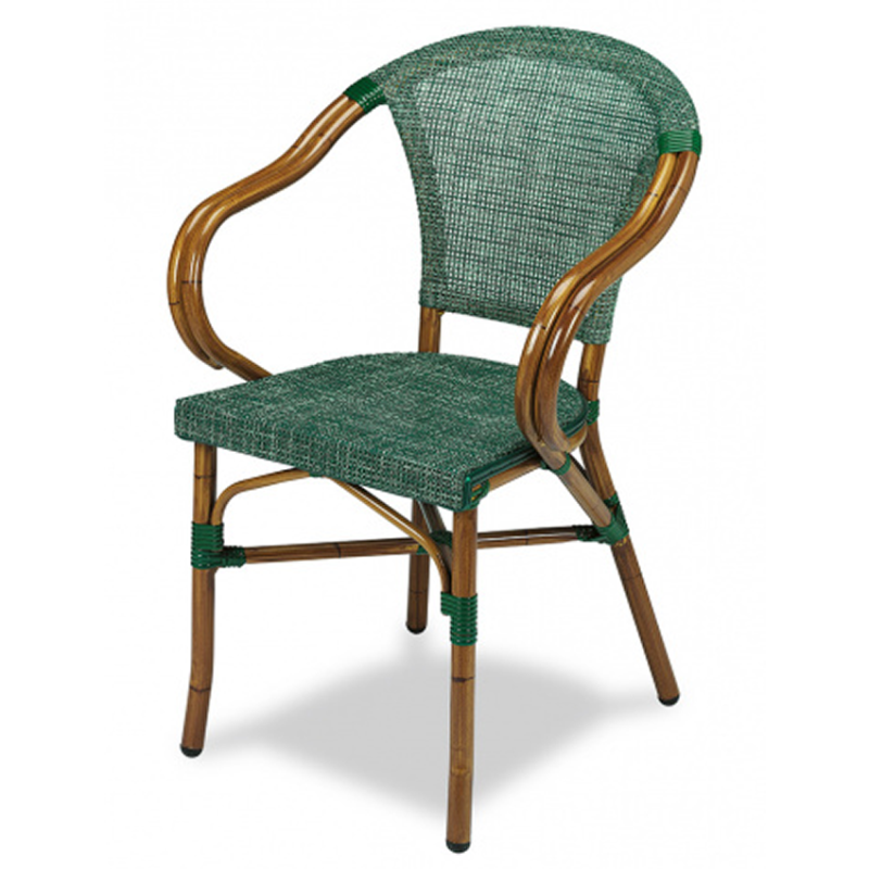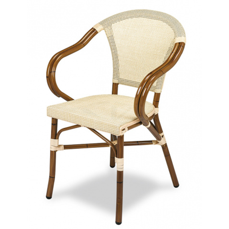 Sillón apilable diseñado para exteriores con un armazón de aluminio plastificado para mayor durabilidad.