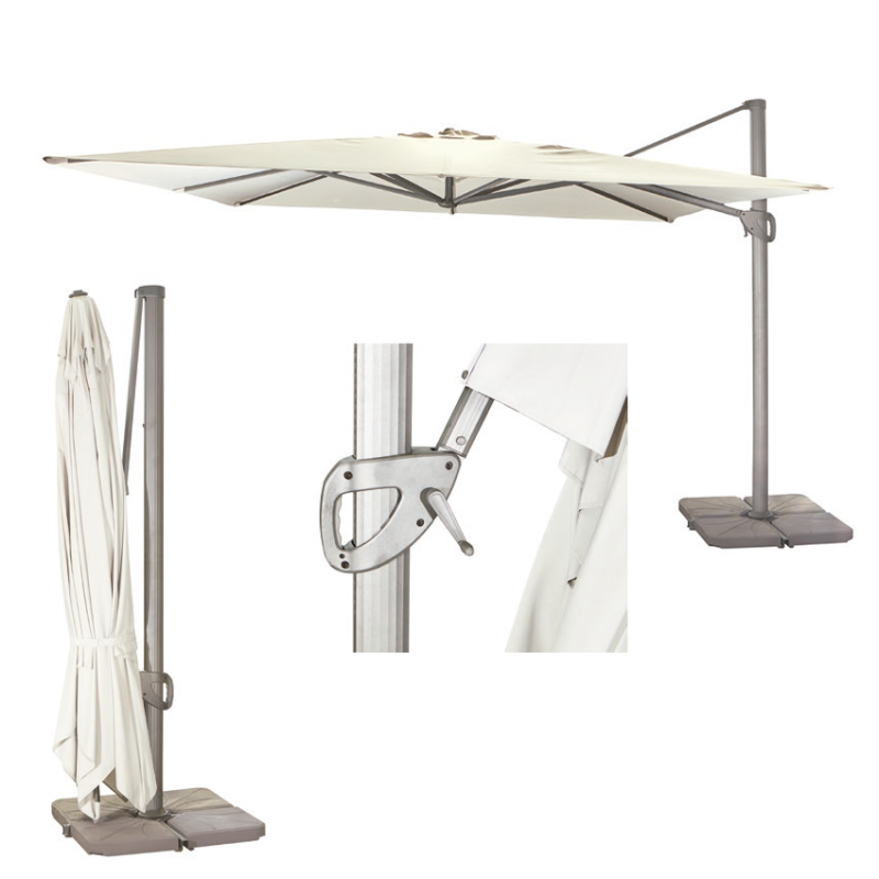 Parrasol cuadrado con una estructura articulada para poder orientar la cobertura del parasol.