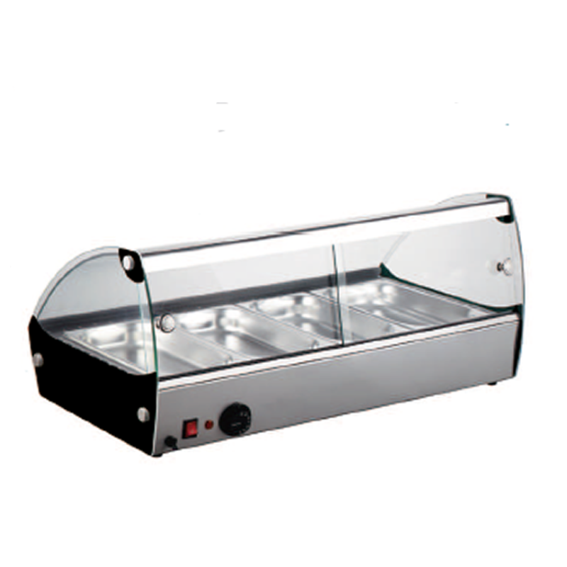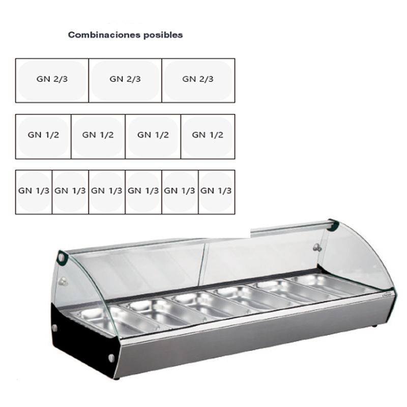 Vitrina de bar caliente mediante calor seco fabricada en acero inoxidable y cristal.