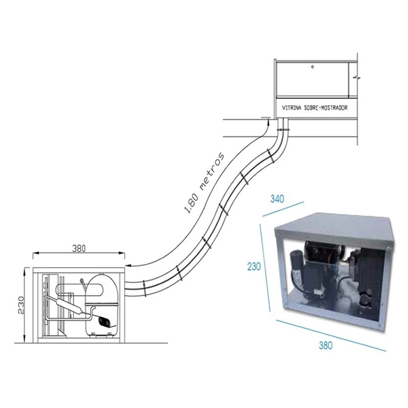 Unidad condensadora Remota protegida y conectada a la vitrina mediante tubo de 2.00 metros con carga de